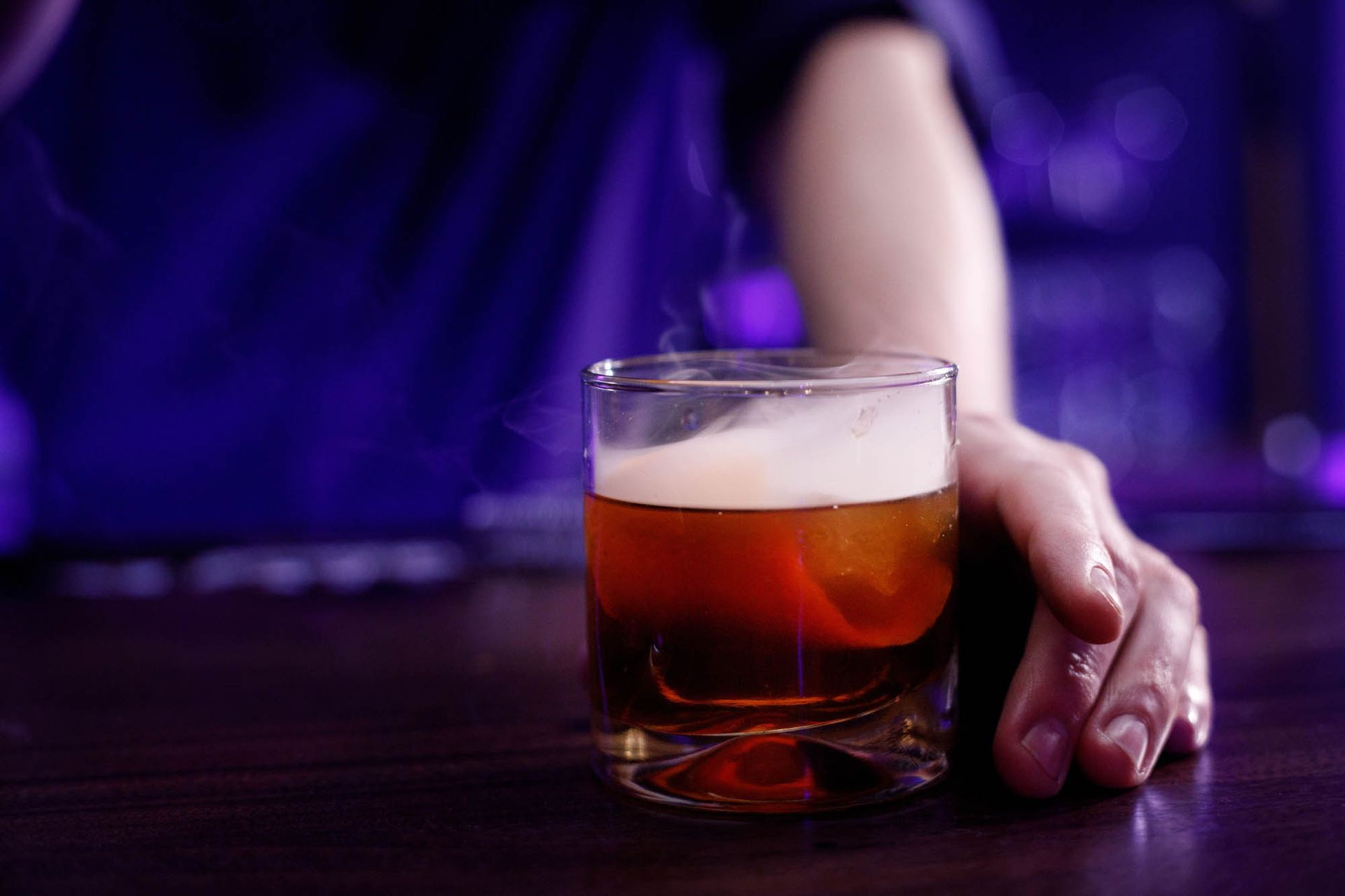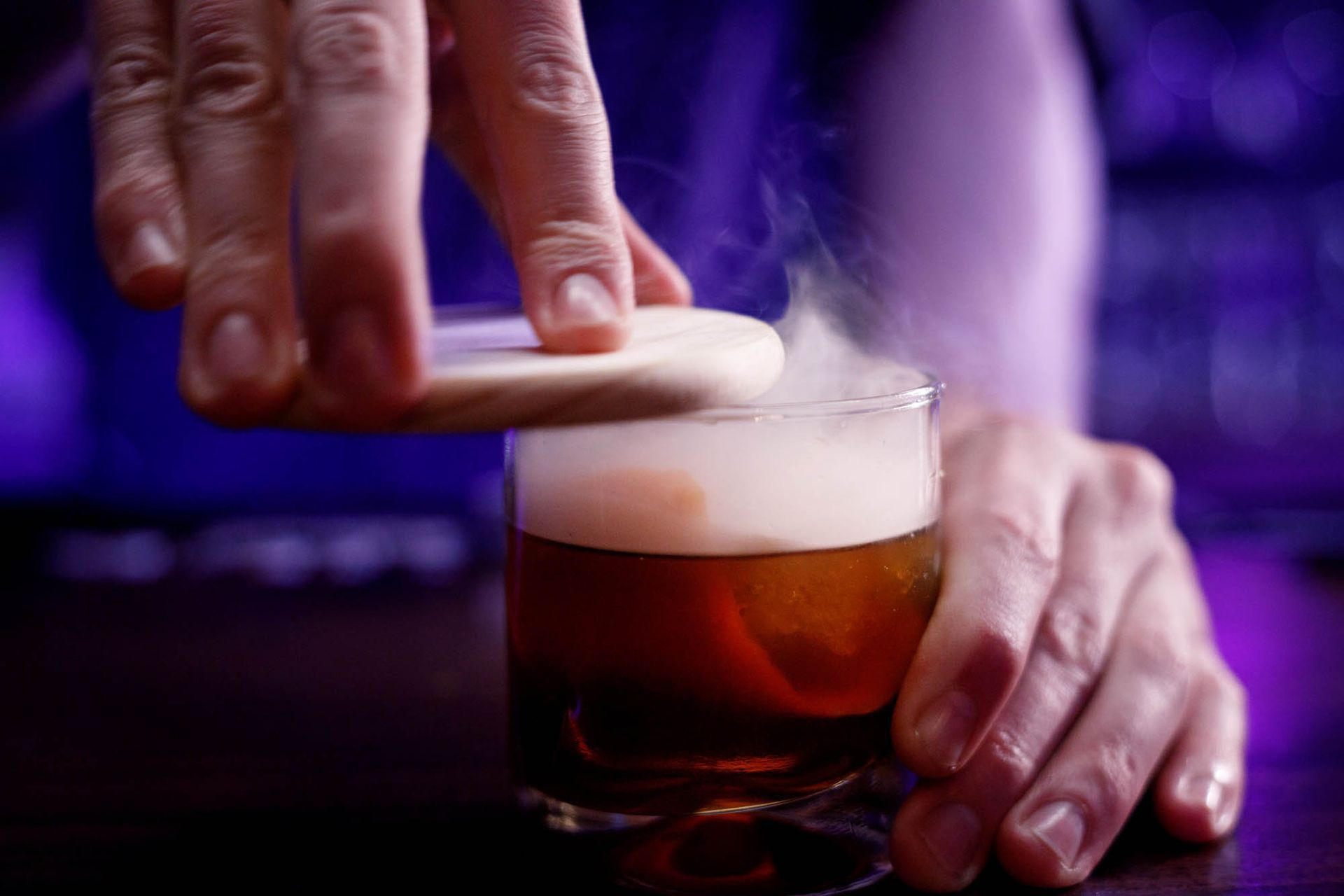 WoodFord Reserve Double Oaked, Brown Sugar Simple, Angostura and Orange Bitters, Cherry Wood Chip Smoke, Toschi Luxardo Cherry
