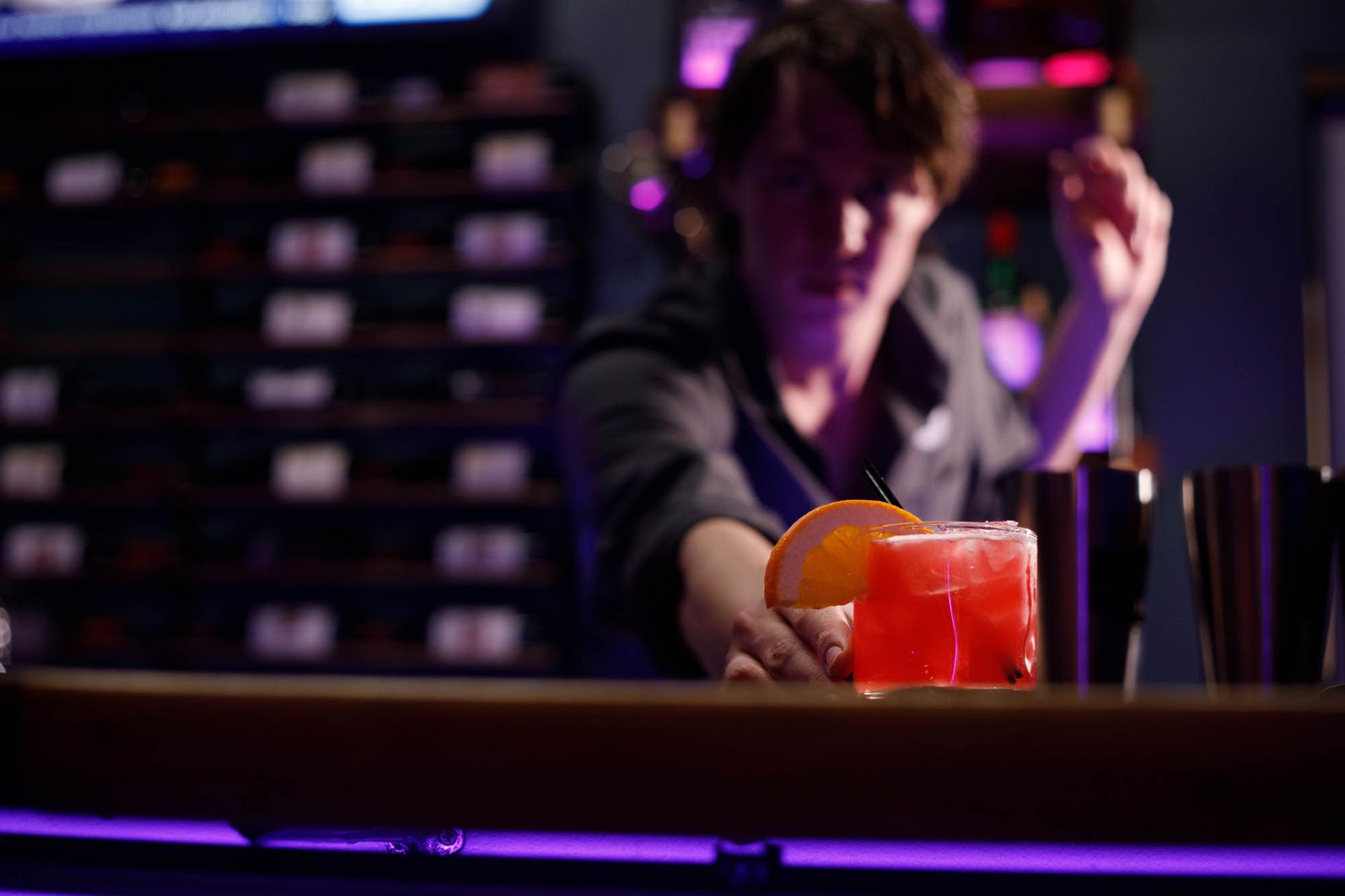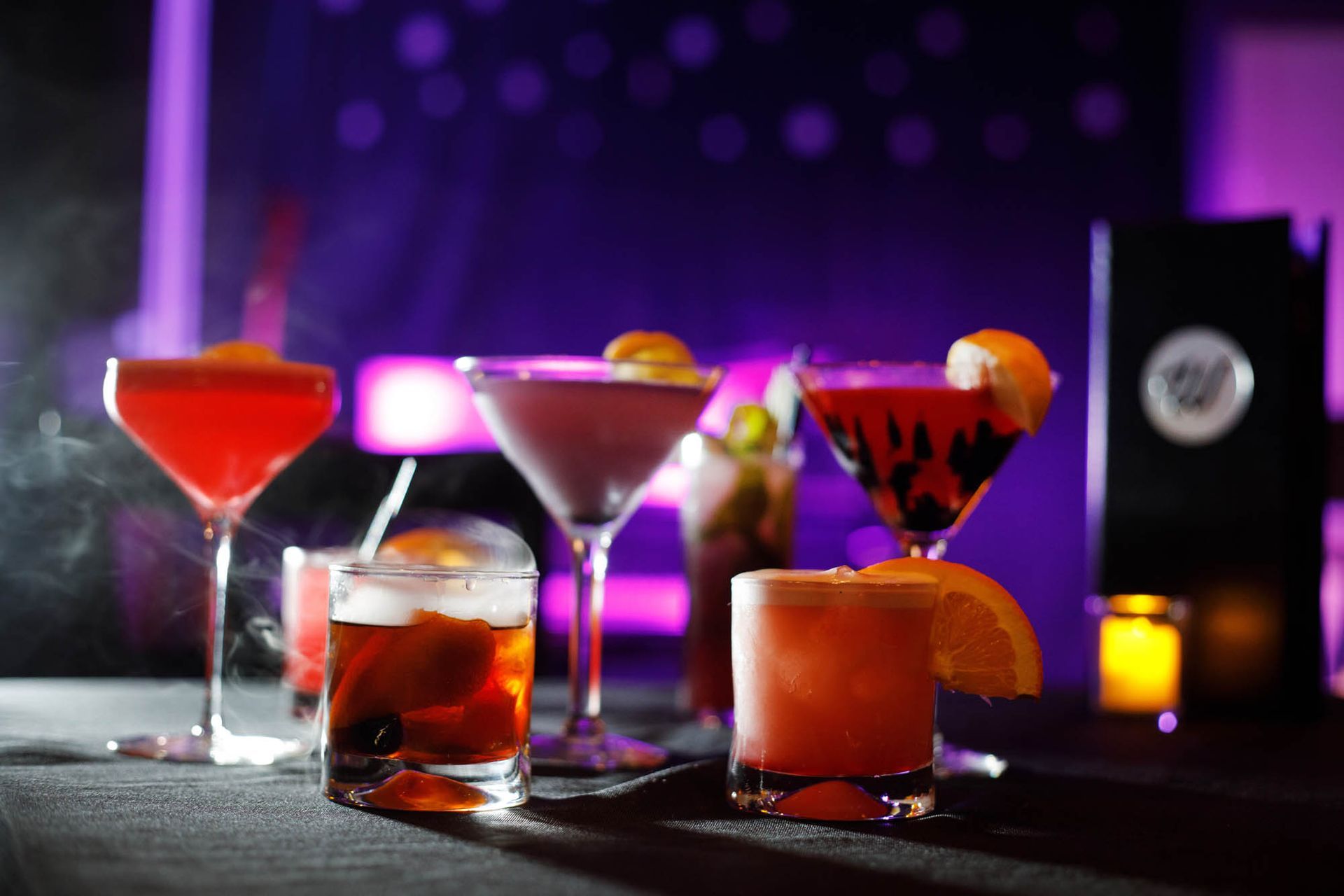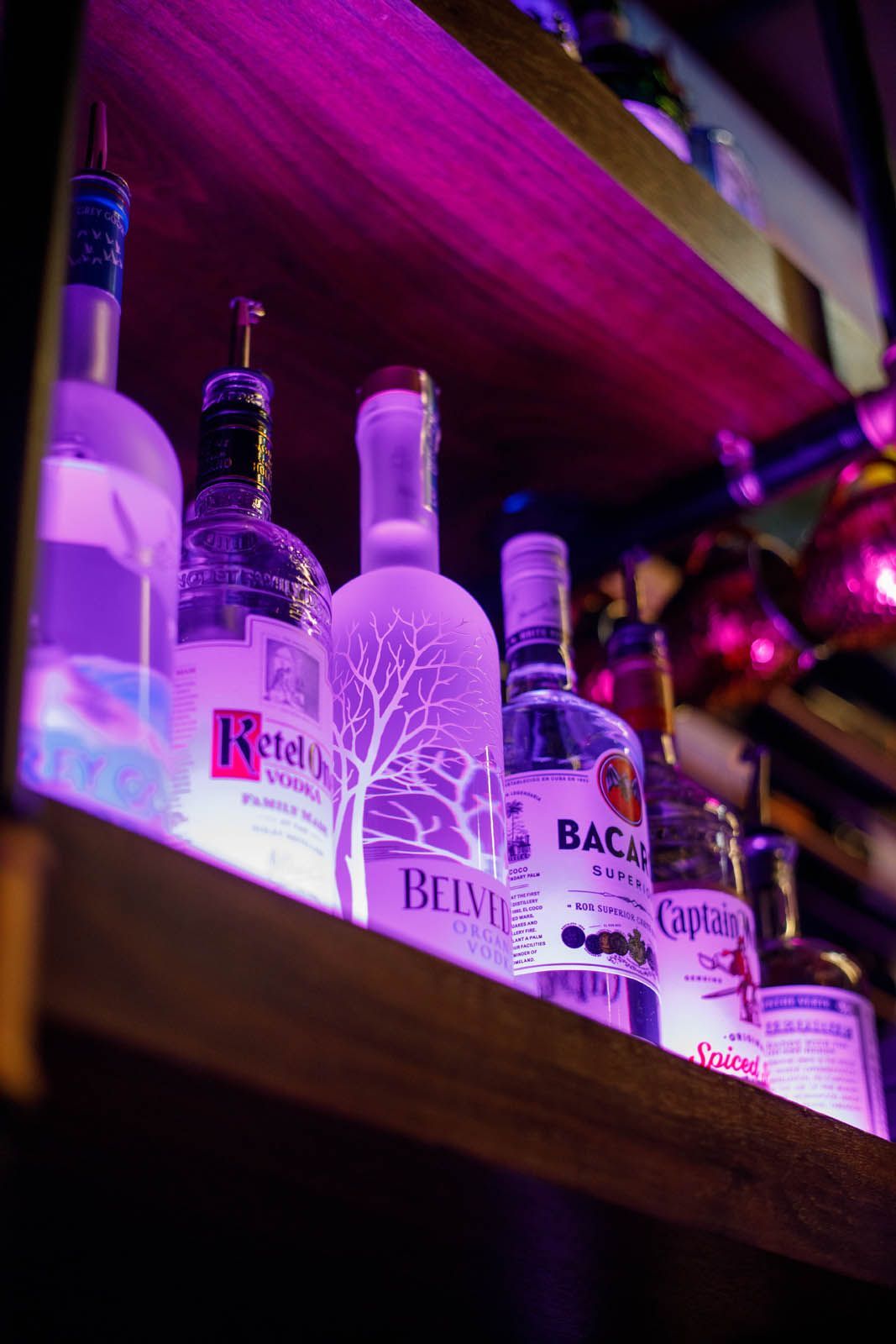 Bacardi Rum, Peach Purée, Blueberry Fruitful, Lime Juice, Simple Syrup, Muddled Basil and Mint Leaves, Club Soda, Lime Wedge