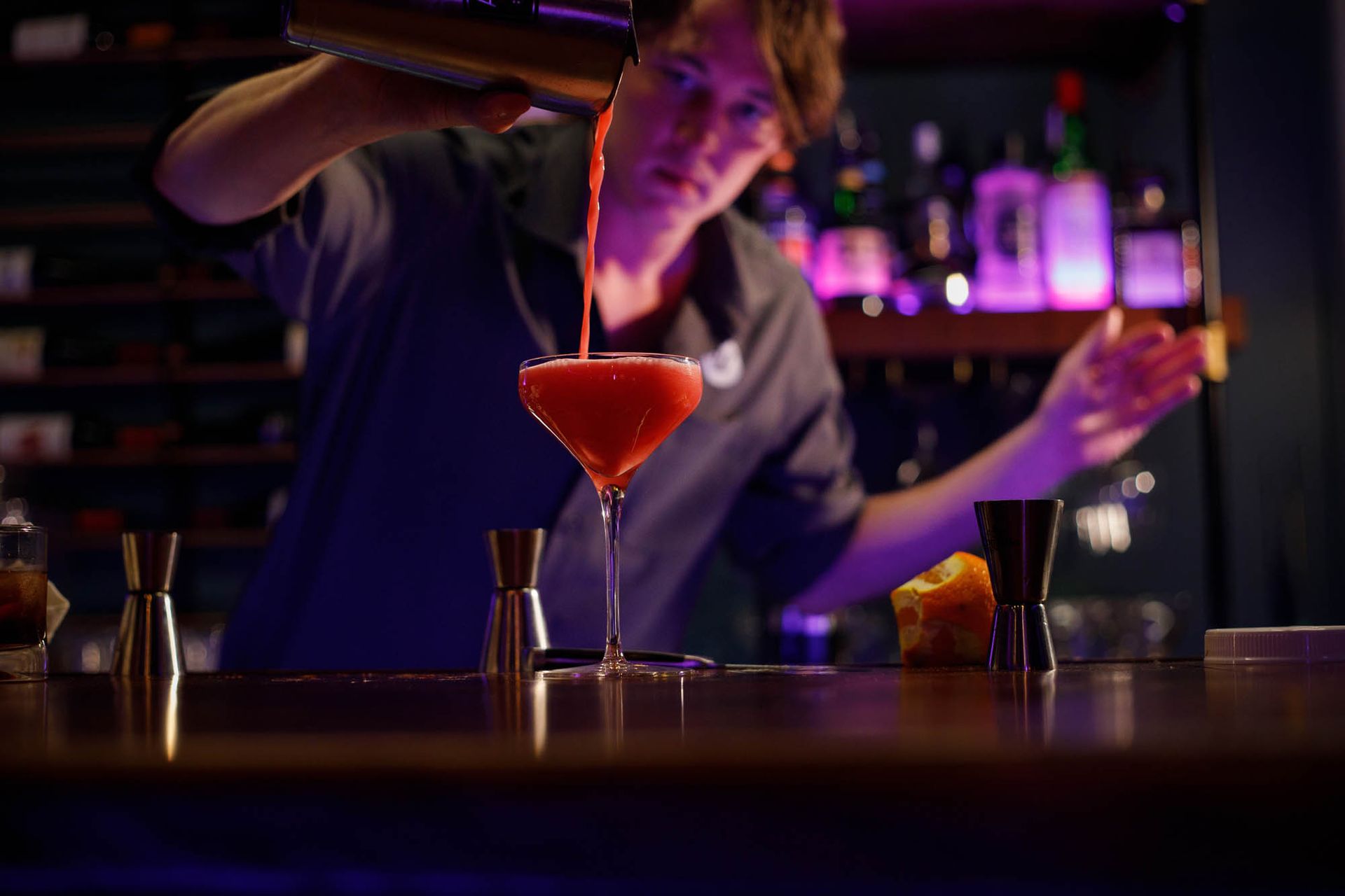 Vanilla Vodka, Raspberry Puree, Lemon Juice, Lillet Blanc, Chocolate Syrup Drizzle, Lemon Garnish